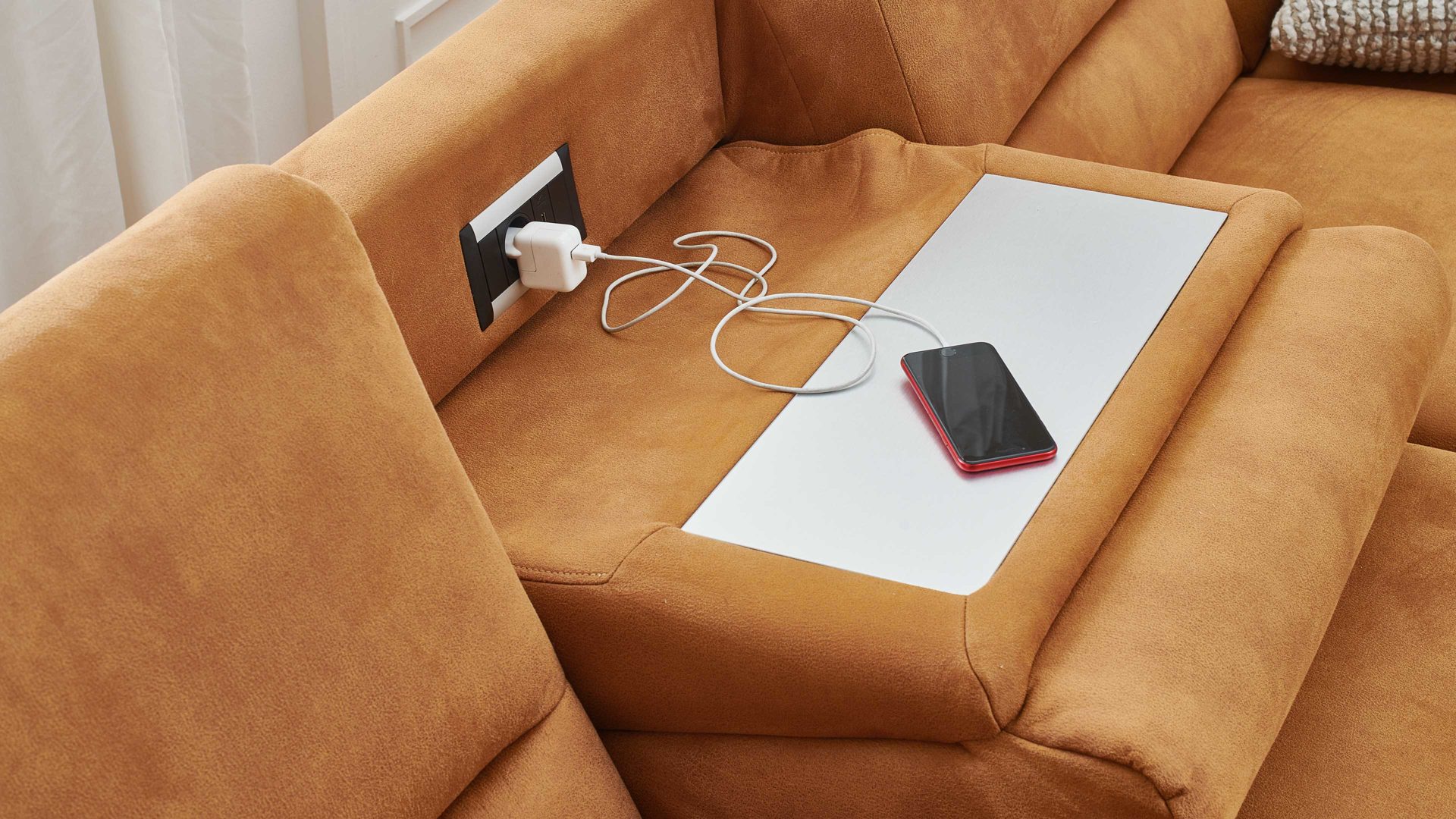 Auf der Rückseite des jeweiligen Rückenpolsters ist eine aluminiumfarbene Ablageplatte in den Bezug eingearbeitet - sie greift den Ton der Couchfüße noch einmal auf und sorgt dadurch für ein harmonisches Gesamtbild. Indem Sie das Rückenpolster nach vorne klappen, schaffen Sie eine praktische Ablagefläche samt Steckdose und USB-Anschluss.