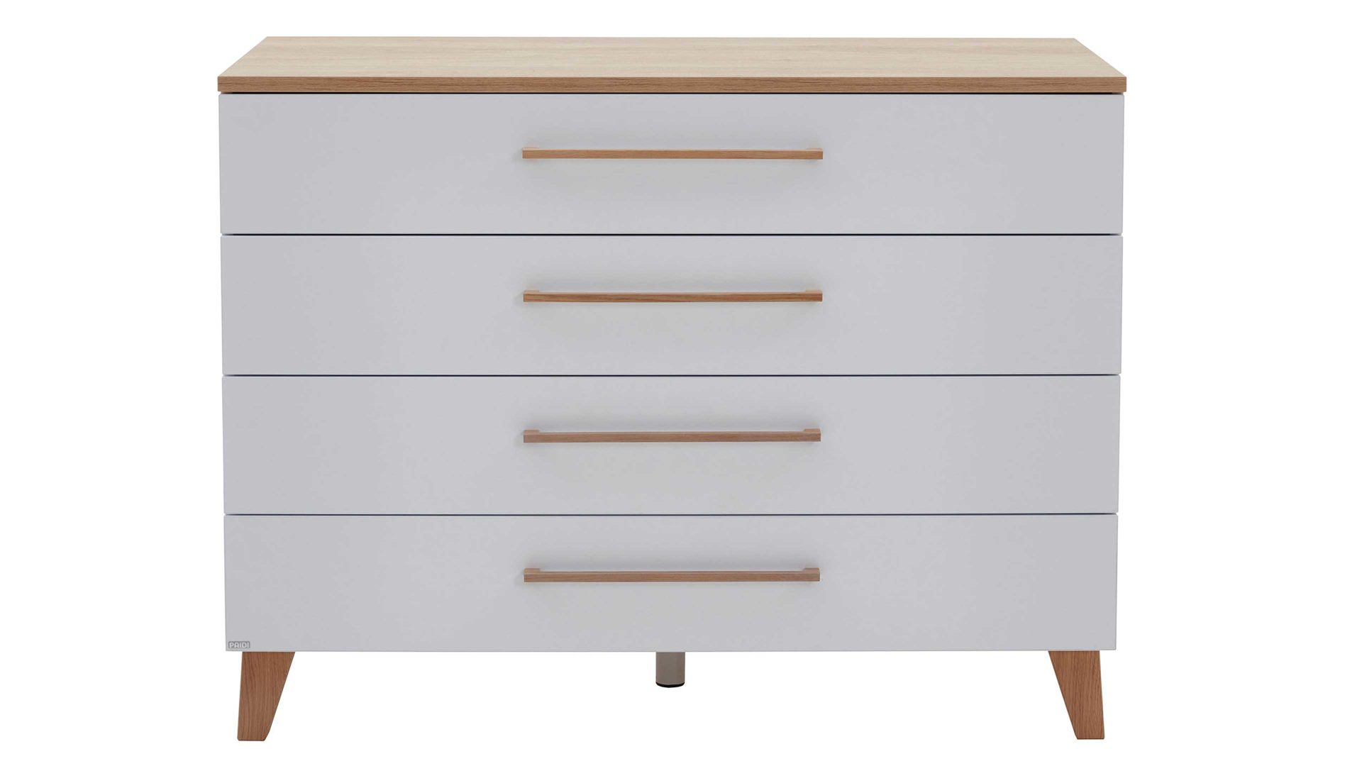 Funktional überzeugt die erstklassig verarbeitete Kommode mit vier Schubladen, von denen die oberste mit Vollauszug ausgestattet ist. Somit steht reichlich Stauraum für Unterwäsche, Bettwäsche, Handtücher und sonstige Textilien oder auch empfindliche Accessoires zur Verfügung, die licht- und staubgeschützt aufbewahrt werden sollen. Der Oberboden des Kommodenschranks bietet Platz für dekorative Elemente, etwa eine Vase oder einen Bilderrahmen mit persönlichem Foto. Gegen Mehrpreis ist der Schrank mit einem Schubladeneinsatz und einem Wickelaufsatz ergänzbar. Auf ca. 124 x 95 x 56 cm (BxHxT) belaufen sich die Maße der praktischen Schubladenkommode.