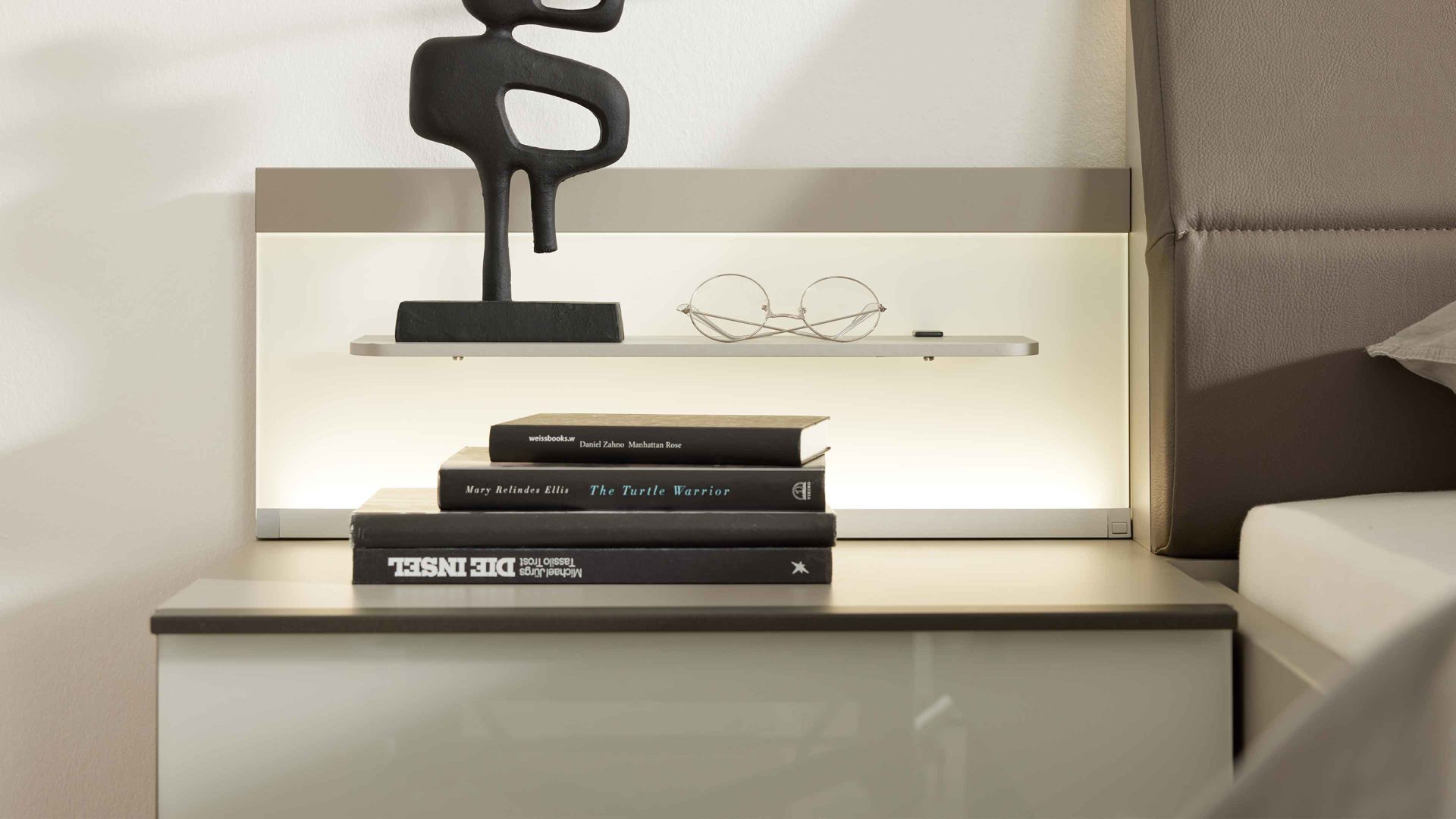 Die Kombination aus kieselgrauen und weißen Kunststoffoberflächen mit weißen Glasauflagen harmoniert perfekt mit der integrierten LED-Beleuchtung. Die fest verbauten LED-Leuchtmittel mit der Energieeffizienzklasse F (Spektrum A bis G) sorgen für ein dezentes, warmes Licht direkt am Bett. Über den praktischen Kippschalter steuerst du die Beleuchtung ganz bequem.