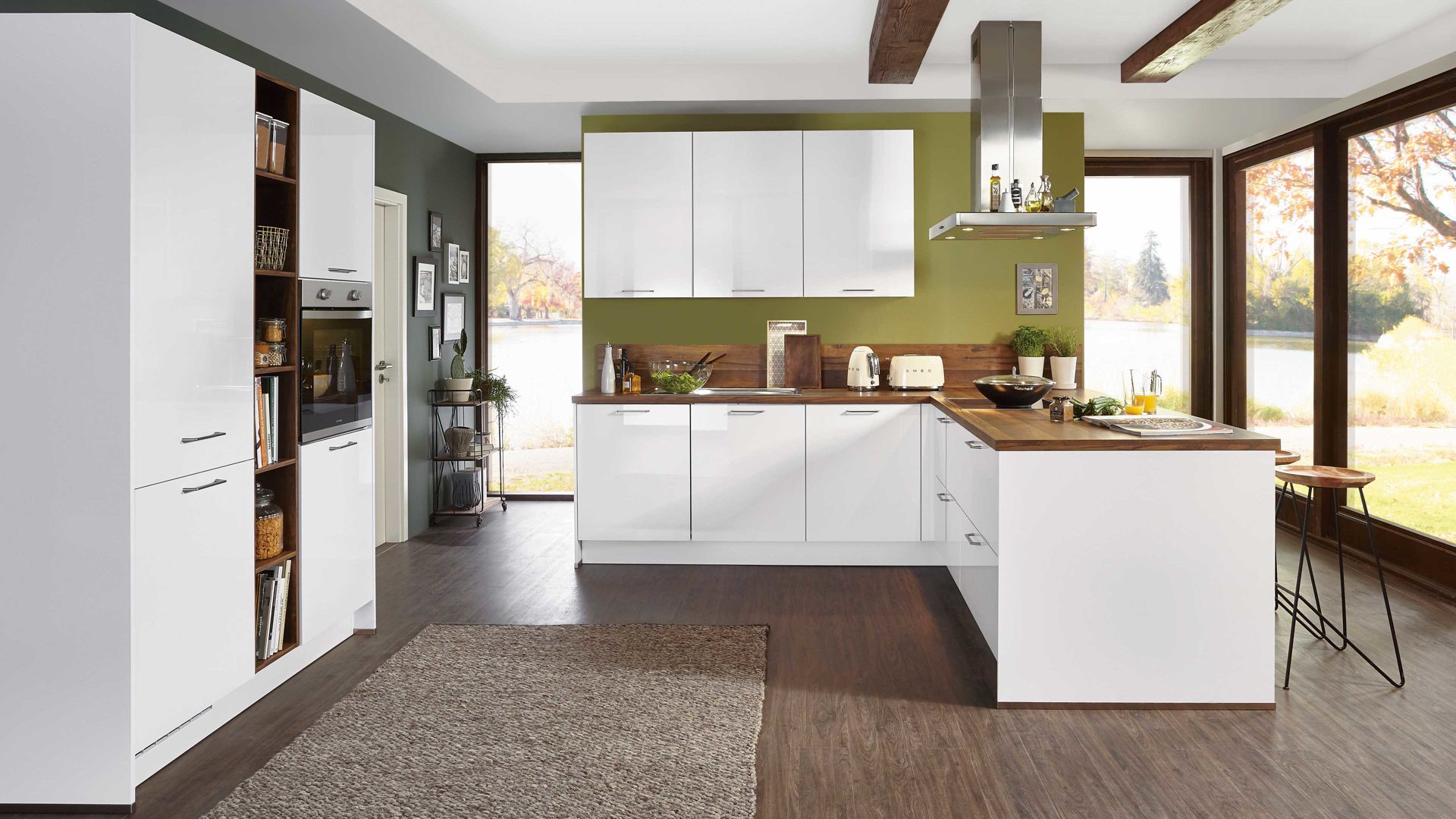 Mit alpinweißen Lackfronten, einem balkeneichefarbenen Korpus und balkeneichefarbenen Arbeitsplatten fügt sich die Planküche hervorragend in viele Wohnkonzept ein.