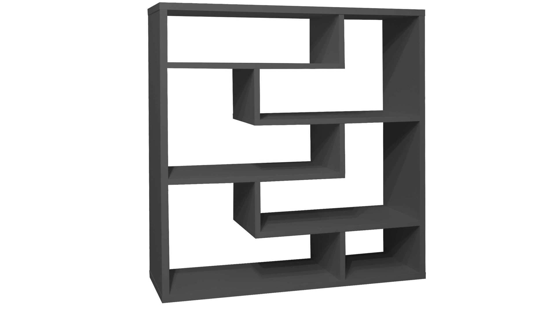 Die trendig-anthrazitfarbenen Mattlackoberflächen und die verspielte, aber dennoch harmonische Anordnung der Böden verleihen dem Raumteiler eine sehr moderne und elegante Ausstrahlung. Er bietet Ihnen insgesamt sechs Fächer, in denen Sie etwa Bücher und Deko aufbewahren können. Doch auch Aktenordner sind hier gut aufgehoben. Die Maße des Regals belaufen sich auf ca. 130 x 134 x 40 cm (BxHxT).